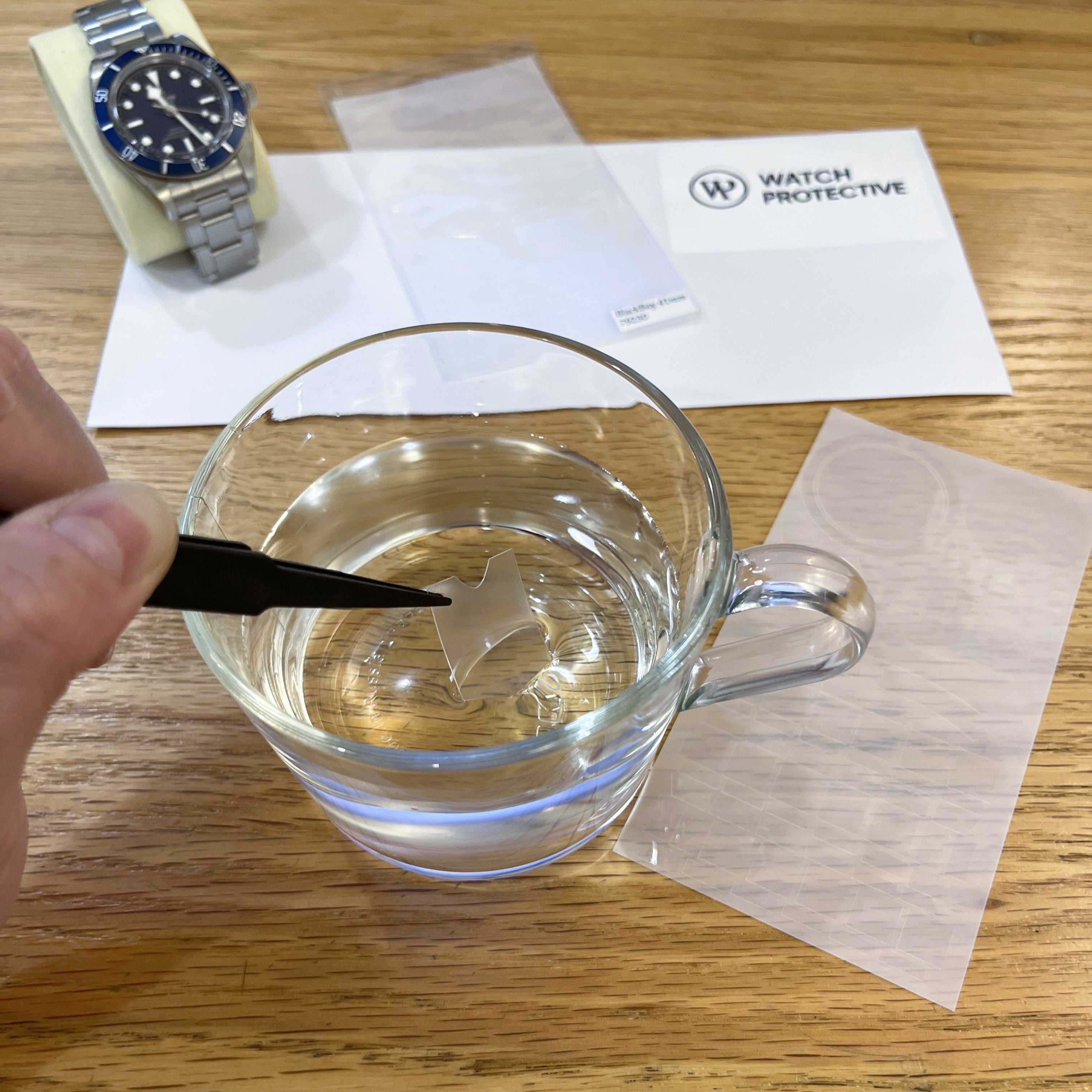 Important: Our adhesive is water-activated. Keep both the watch surface and the adhesive side of the film wet during placement.